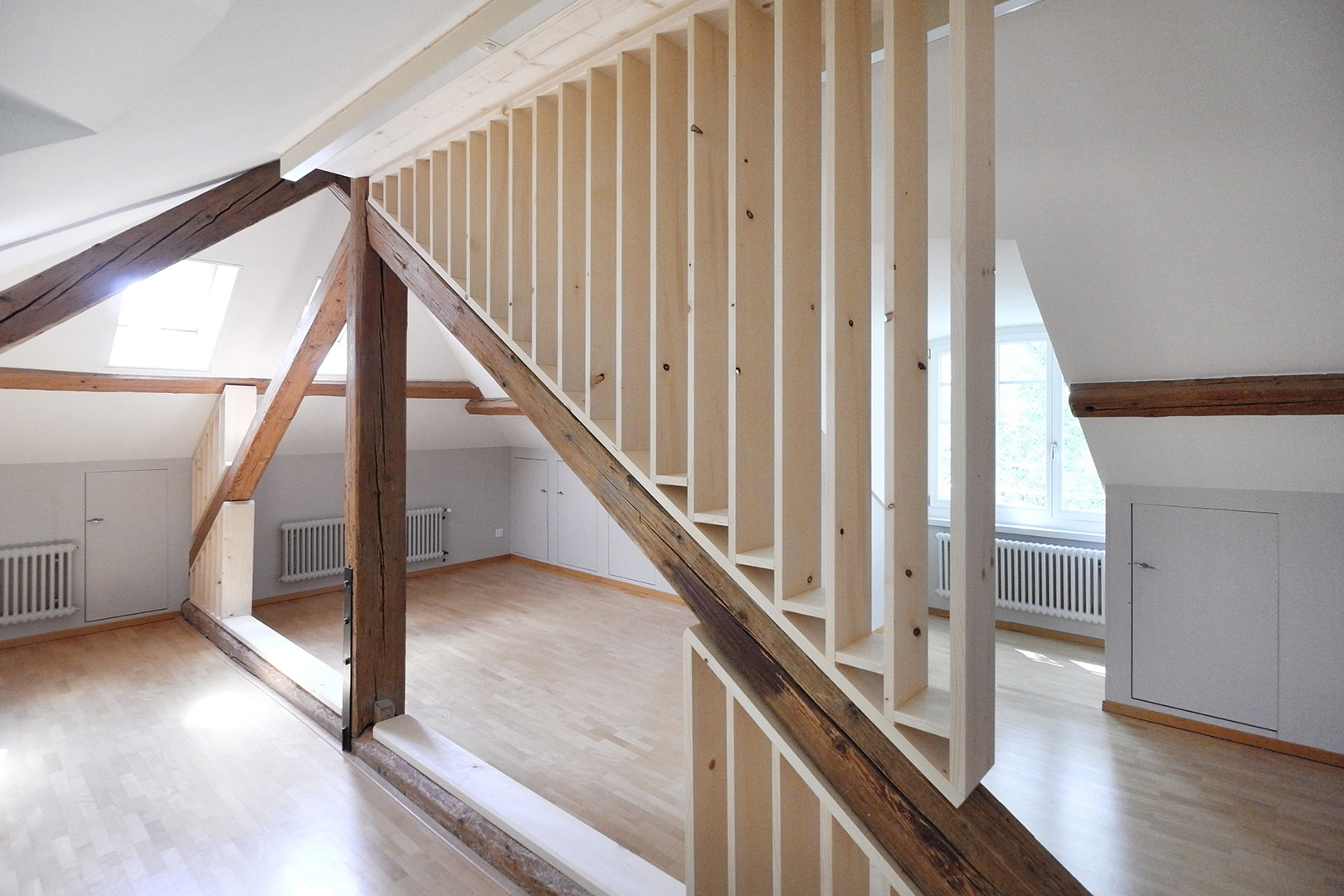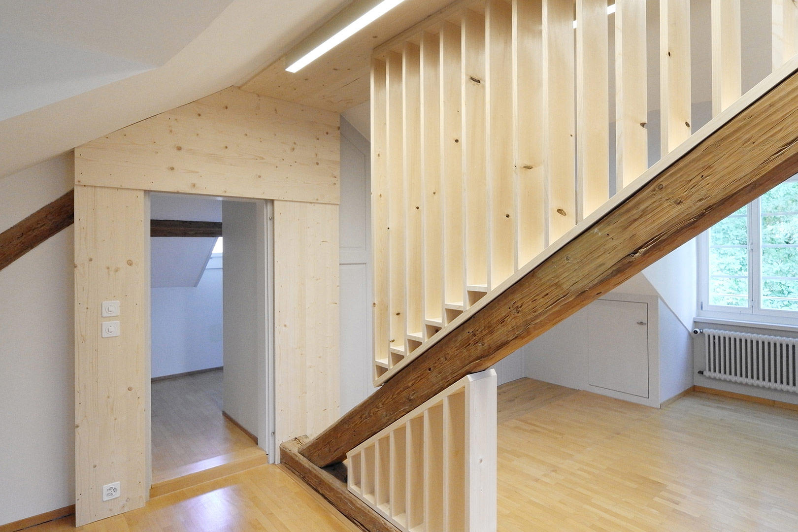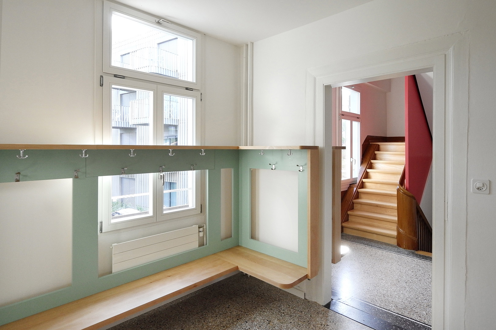 Das 2005 in eine Wohnung umgebaute Ober-und Dachgeschoss wurde durch einen sorgfältigen Umbau mit minimalen architektonischen Eingriffen in einen Kindergarten umgestaltet.