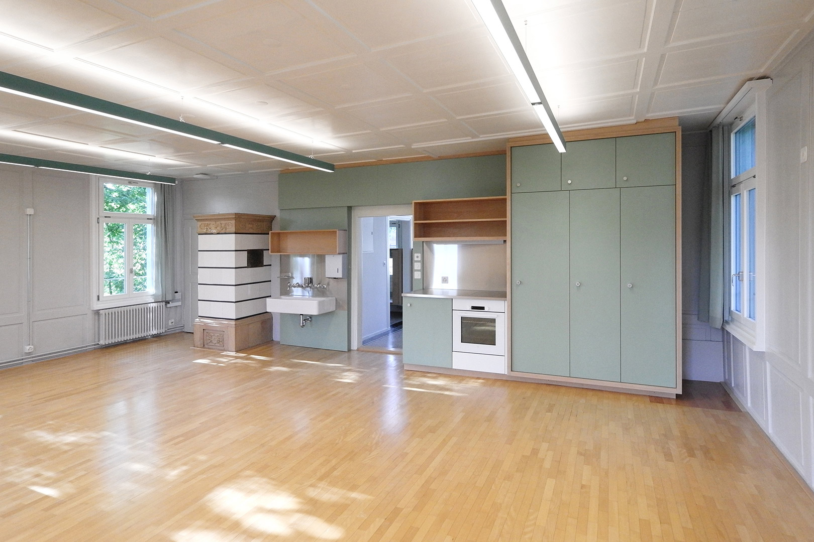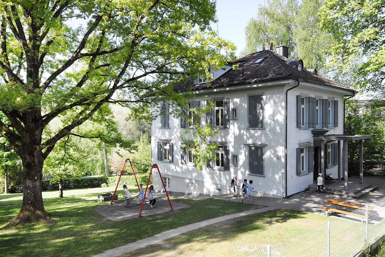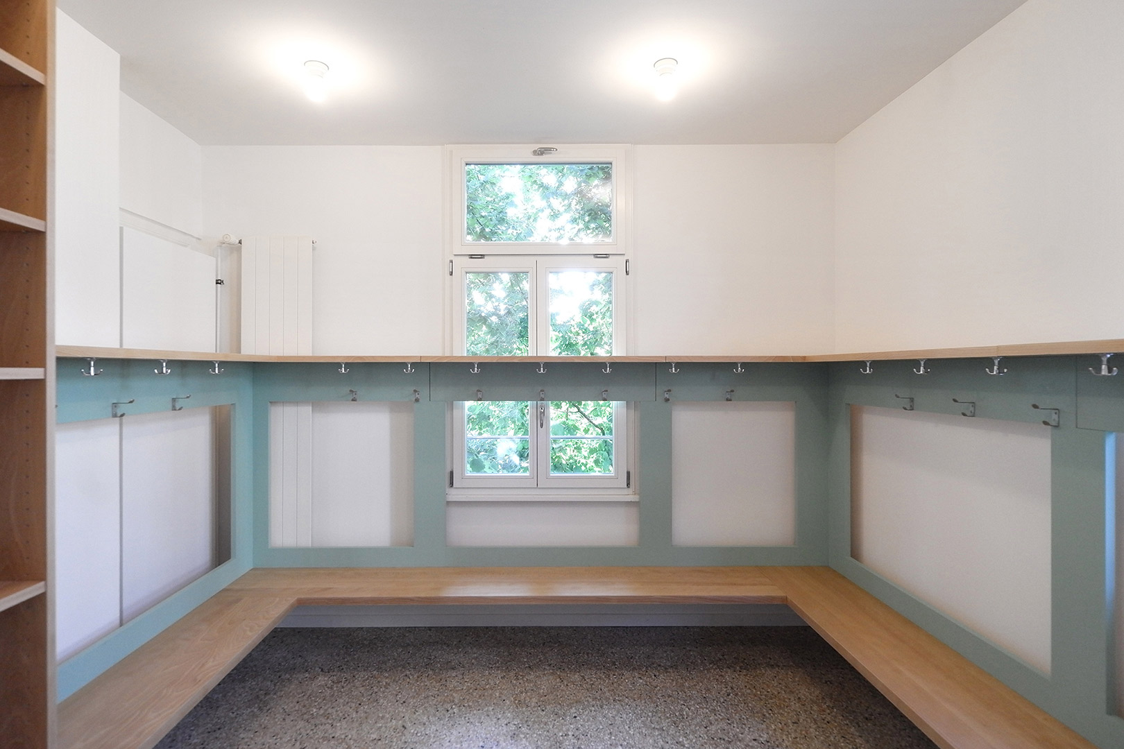 Bewusst wurden die in Weiss- und Grautönen gehaltenen ehemaligen Wohnräumlichkeiten mit warmen Farbtönen ergänzt, damit sich die Kinder in geborgenen und anregenden Räumen bewegen können.