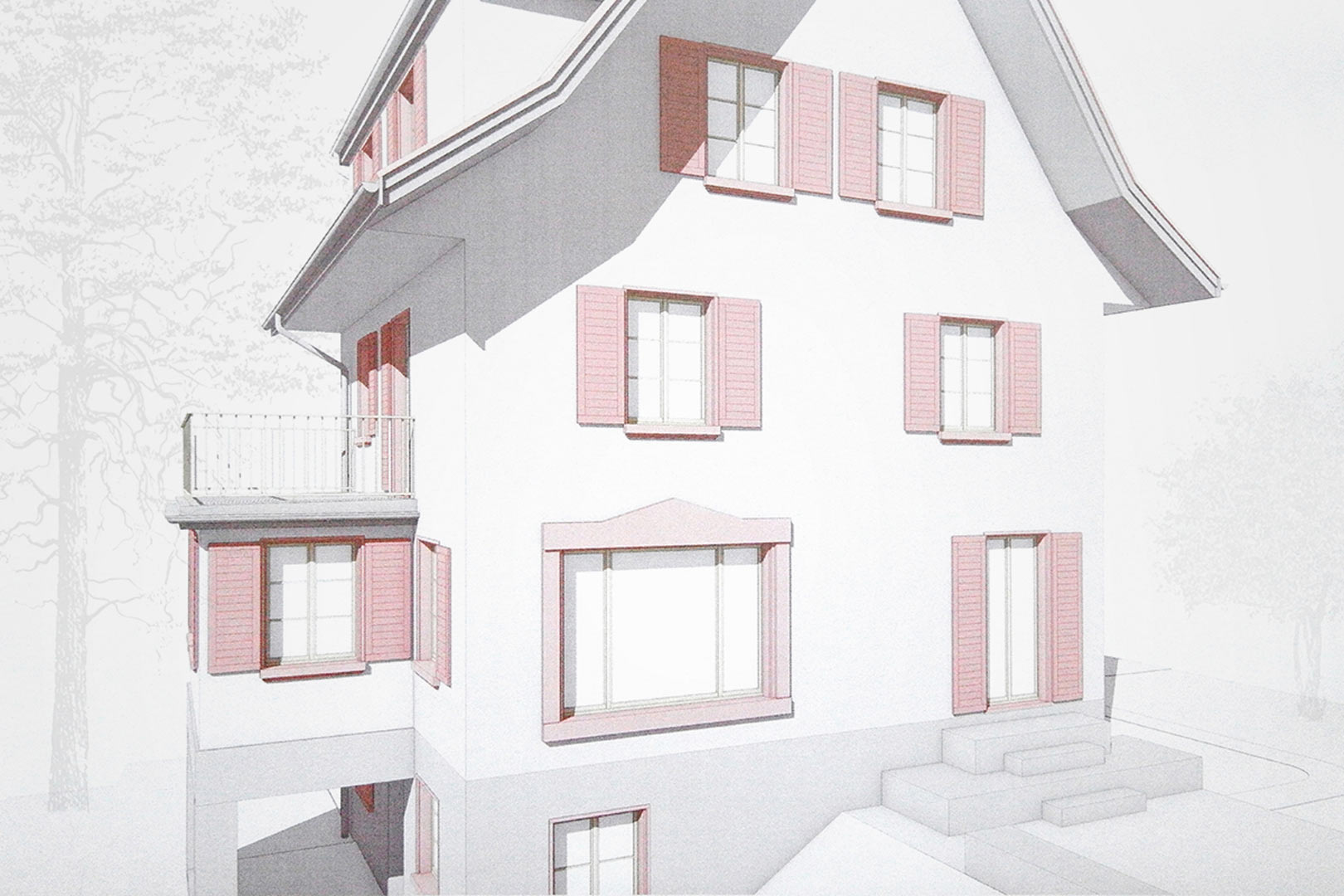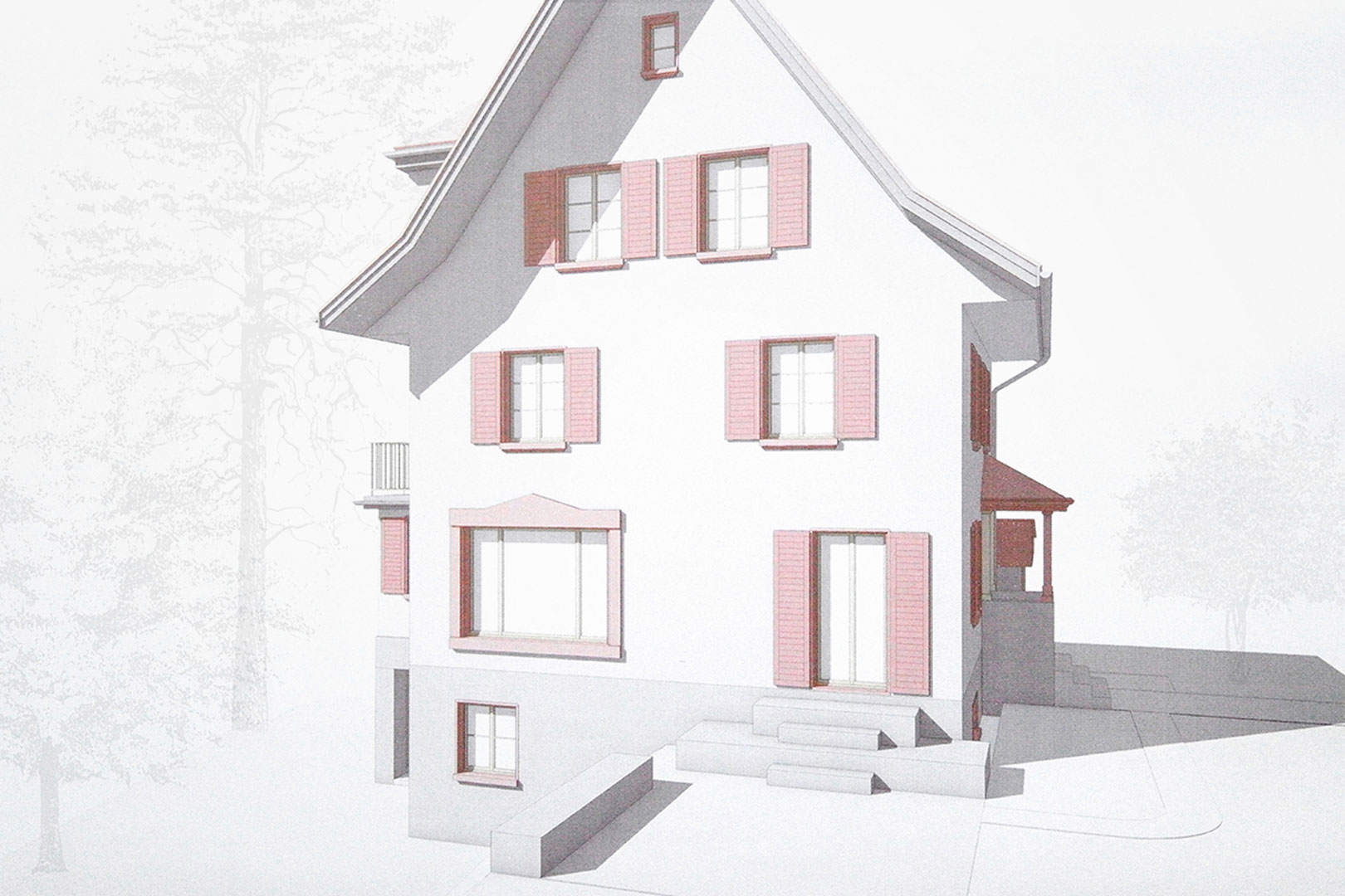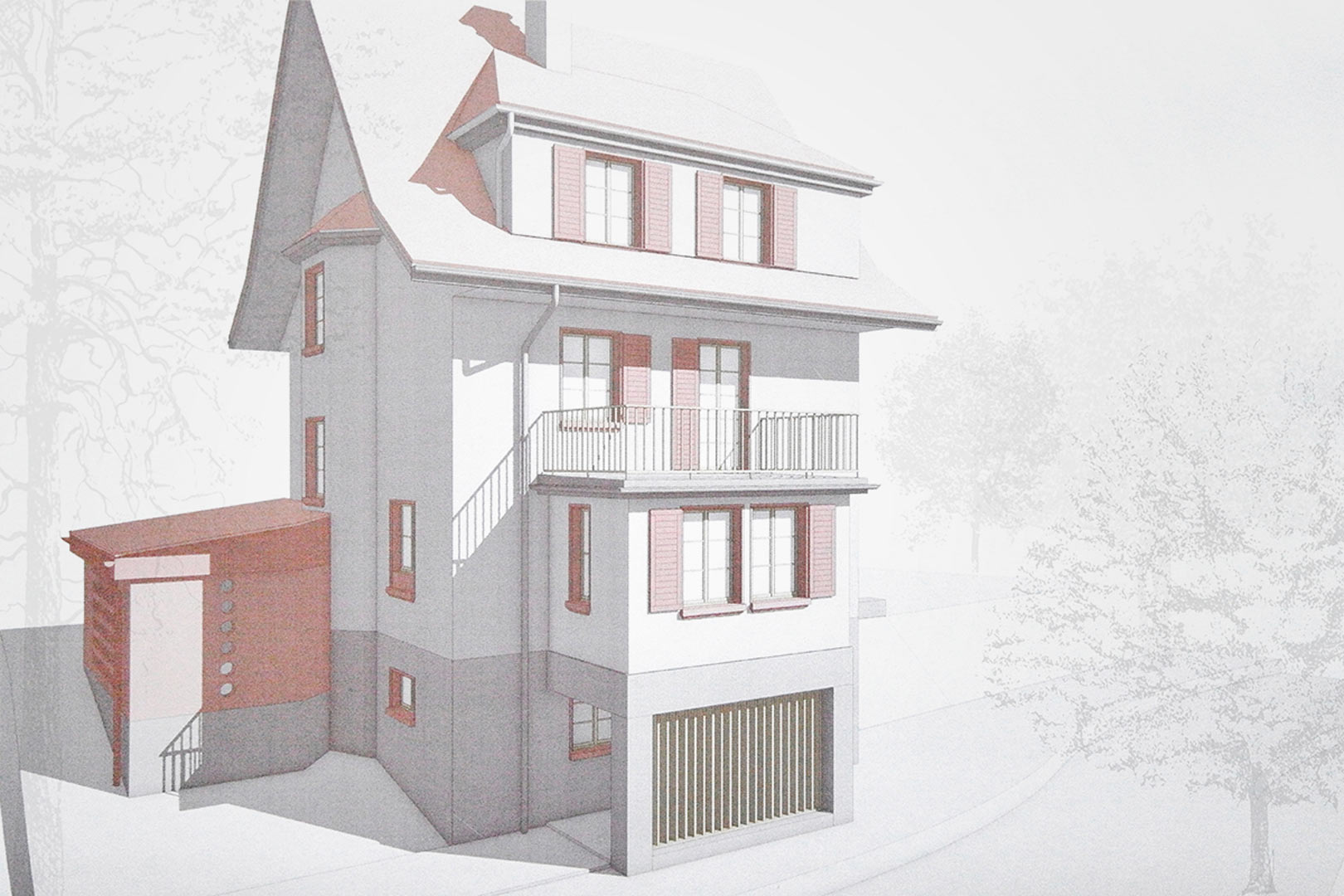 Das 1931 erbaute Wohnhaus an der Fliederstrasse in St. Gallen liegt im Ortsbildschutzgebiet und ist neu das Zuhause einer kleinen Familie mit dem Wunsch, dass das Gebäude in die heutige Zeit geführt wird, mit neuer Küche, Bädern und diversen Eingriffen zur architektonischen Aufwertung und einem möglichen Garagenanbau.